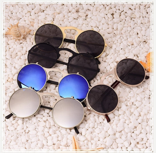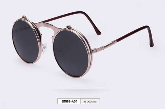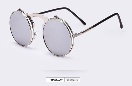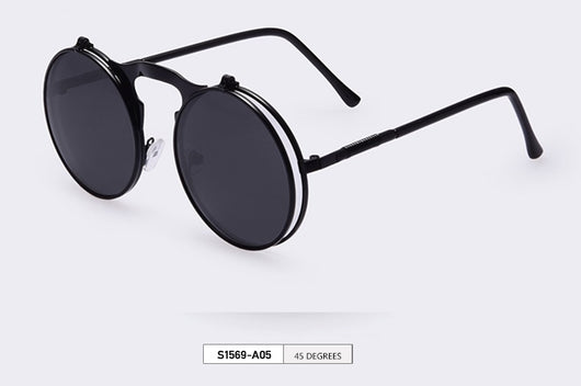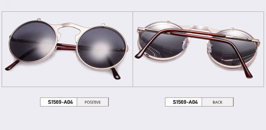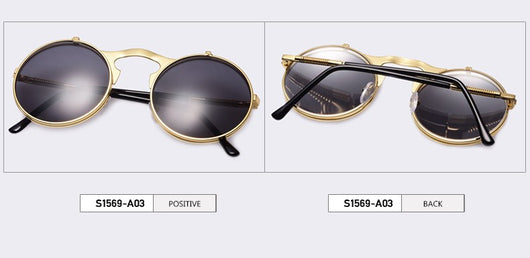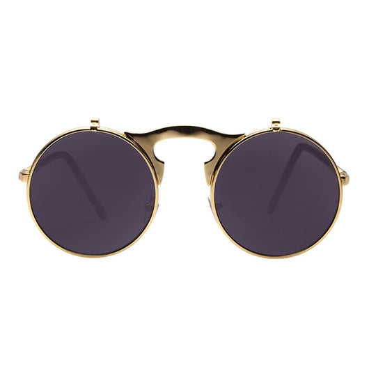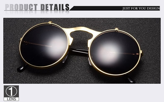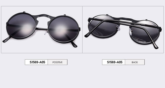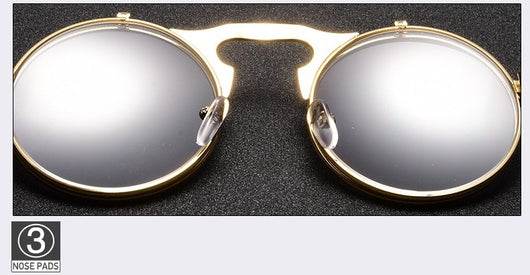 Featuring a retro punk look with large, round UV protection lenses that can be pulled up to expose your eyes for that sizzling and stunning style. The nose pads connect to the frame in such a concise arch that gives additional luxury touch. Available in 5 exquisite color  combination. Works best when maintaining a stoic, doesn't give a damn face!